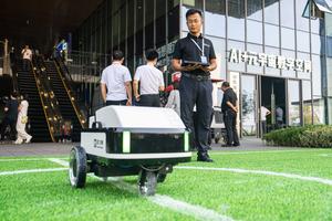 (250915) -- CHANGSHA, 15 septiembre, 2025 (Xinhua) -- Un empleado (frente) opera un robot de dibujo de líneas diseñado para patios de juegos durante la Cumbre de Internet Yuelu 2025, en la Nueva Area de Xiangjiang de Changsha, capital de la provincia de Hunan, en el centro de China, el 15 de septiembre de 2025. Enfocándose en tecnologías de vanguardia como inteligencia artificial, la cumbre comenzó aquí el lunes. (Xinhua/Chen Sihan) (rtg) (ah) (ce)
