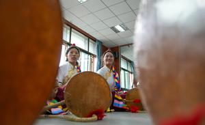 (250916) -- LHASA, 16 septiembre, 2025 (Xinhua) -- Imagen del 9 de septiembre de 2025 de estudiantes tomando un descanso durante una práctica de danza Reba en la escuela secundaria vocacional y técnica no. 2, en Lhasa, en la región autónoma de Xizang, en el suroeste de China. La danza Reba es una forma de danza con tambores, y una mezcla de artes escénicas, que integra narración de cuentos, canto, baile y acrobacias. (Xinhua/Jigme Dorje) (oa) (ah) (vf)