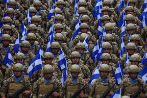 (250915) -- SAN SALVADOR, 15 septiembre, 2025 (Xinhua) -- Soldados de las Fuerzas Armadas de El Salvador marchan durante un desfile por la celebración del 204 aniversario del Día de Independencia de El Salvador, en el departamento de San Salvador, capital de El Salvador, el 15 de septiembre de 2025. Miles de salvadoreños colmaron el lunes las calles de San Salvador, la capital, para conmemorar los 204 años de independencia de Centroamérica de España, en un desfile cívico militar que, pese a las lluvias nocturnas, inició puntualmente a las 8:00 hora local con un ambiente de música, color y orgullo nacional.(Xinhua/Alexander Peña) (ap) (rtg) (ah) (ce)