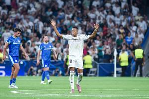 (250917) -- MADRID, 17 septiembre, 2025 (Xinhua) -- Imagen del 16 de septiembre de 2025 de Kylian Mbappe, de Real Madrid, festejando su anotación durante el partido de la primera ronda de la Liga de Campeones de la UEFA, entre Real Madrid y Olympique Marseille, en Madrid, España. (Xinhua/Gustavo Valiente) (ah) (vf)