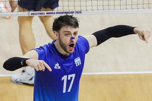(250916) -- CIUDAD QUEZON, 16 septiembre, 2025 (Xinhua) -- Luciano Vicentín, de Argentina, reacciona después de marcar un punto durante el partido del grupo C entre Argentina y República de Corea, en el Campeonato Mundial Masculino de la FIVB 2025, en Ciudad Quezón, Filipinas, el 16 de septiembre de 2025. (Xinhua/Rouelle Umali) (oa) (ah) (ce)