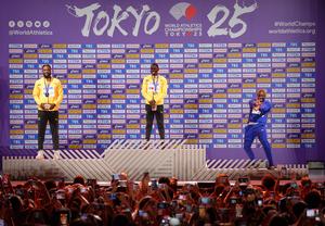 (250915) -- TOKIO, 15 septiembre, 2025 (Xinhua) -- El medallista de oro, Oblique Seville (c), de Jamaica, el medallista de plata, Kishane Thompson (i), de Jamaica, y el medallista de bronce, Noah Lyle, de Estados Unidos, posan durante la ceremonia de premiación de los 100m masculinos, en el Campeonato Mundial de Atletismo 2025, en Tokio, Japón, el 15 de septiembre de 2025. (Xinhua/Ju Huanzong) (rtg) (ah) (ce)
