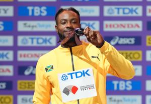 (250915) -- TOKIO, 15 septiembre, 2025 (Xinhua) -- El medallista de plata, Kishane Thompson, de Jamaica, posa durante la ceremonia de premiación de los 100m masculinos, en el Campeonato Mundial de Atletismo 2025, en Tokio, Japón, el 15 de septiembre de 2025. (Xinhua/Ju Huanzong) (rtg) (ah) (ce)