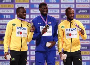 JAPON-TOKIO-ATLETISMO-CAMPEONATO MUNDIAL DE ATLETISMO-110M VALLAS MASCULINOS-CEREMONIA DE PREMIACION