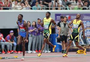 (250916) -- TOKIO, 16 septiembre, 2025 (Xinhua) -- Cordell Tinch (i), de Estados Unidos, Orlando Bennett (c), de Jamaica, y Tyler Mason, de Jamaica, reaccionan al término de la final de 110m vallas masculinos, en el Campeonato Mundial de Atletismo 2025, en Tokio, Japón, el 15 de septiembre de 2025. (Xinhua/Li Gang) (oa) (ah) (vf)