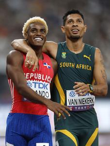 (250917) -- TOKIO, 17 septiembre, 2025 (Xinhua) -- Alexander Ogando (i), de República Dominicana, y Wayde Van Niekerk, de Sudáfrica, son vistos al término de las eliminatorias de 200m masculinos, en el Campeonato Mundial de Atletismo de 2025, en Tokio, Japón, el 17 de septiembre de 2025. (Xinhua/Wang Lili) (ah) (vf)