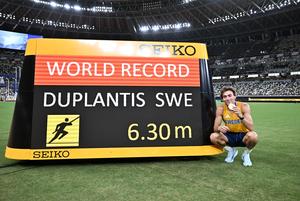 (250915) -- TOKIO, 15 septiembre, 2025 (Xinhua) -- Armand Duplantis, de Suecia, posa con su nuevo récord mundial al término de la final de salto con pértiga masculino, en el Campeonato Mundial de Atletismo 2025, en Tokio, Japón, el 15 de septiembre de 2025. (Xinhua/Song Yanhua) (rtg) (ah) (ce)