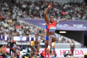 (250916) -- TOKIO, 16 septiembre, 2025 (Xinhua) -- Leyanis Pérez Hernández, de Cuba, compite durante la clasificación de triple salto femenino en el Campeonato Mundial de Atletismo de 2025, en Tokio, Japón, el 16 de septiembre de 2025. (Xinhua/Song Yanhua) (oa) (ah) (vf)