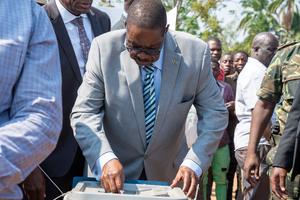 (250917) -- GOLIATI, 17 septiembre, 2025 (Xinhua) -- Imagen del 16 de septiembre de 2025 del expresidente de Malaui Peter Mutharika emitiendo su voto en un centro de votación, en Goliati, en el distrito de Thyolo, en el sur de Malaui. El tan esperado ejercicio de votación comenzó a las 6:00 (hora local) del martes y en los centros de votación de todo el país se formaron largas filas. (Xinhua/Joseph Mizere) (jg) (da) (vf)