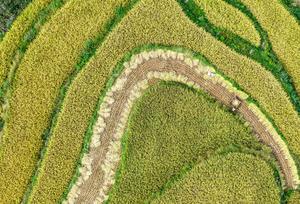 (250918) -- CHONGQING, 18 septiembre, 2025 (Xinhua) -- Vista aérea tomada con un dron el 18 de septiembre de 2025 de un agricultor trabajando en un campo de arroz, en el poblado de Wuli, en el distrito de Qianjiang, en la municipalidad de Chongqing, en el suroeste de China. El poblado de Wuli de Chongqing, que alberga aproximadamente 5.300 mu (cerca de 353,33 hectáreas) de arrozales, recientemente ha entrado a la temporada de cosecha de arroz. (Xinhua/Tang Yi) (rtg) (ra)