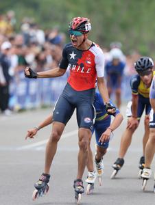 (250919) -- QINHUANGDAO, 19 septiembre, 2025 (Xinhua) -- Gabriel Reyes, de Chile, festeja al término de la final masculina junior por eliminación de 15000m en el Campeonato Mundial de Patinaje de Velocidad en Ruta 2025, en el distrito de Beidaihe de Qinhuangdao, en la provincia de Hebei, en el norte de China, el 19 de septiembre de 2025. (Xinhua/Yang Shiyao) (oa) (ra) (vf)