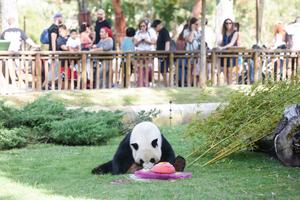 (250921) -- MADRID, 21 septiembre, 2025 (Xinhua) -- Imagen del 20 de septiembre de 2025 de visitantes observando al panda gigante Jin Xi alimentándose de su almuerzo de cumpleaños en el Zoo Aquarium de Madrid, en Madrid, España. El zoológico celebró el sábado una serie de actividades culturales y educativas, entre ellas presentaciones acrobáticas, para celebrar el quinto cumpleaños de dos pandas gigantes. El macho Jin Xi y la hembra Zhu Yu, ambos nacidos en 2020, llegaron al zoológico el 29 de abril del año pasado. (Xinhua/Gustavo Valiente) (oa) (ah)