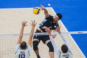 (250921) -- CIUDAD DE PASAY, 21 septiembre, 2025 (Xinhua) -- Joaquín Galleyo (c-atrás), de Argentina, compite durante el partido de octavos de final entre Italia y Argentina, en el Campeonato Mundial Masculino de la FIVB 2025, en la Ciudad de Pasay, Filipinas, el 21 de septiembre de 2025. (Xinhua/Rouelle Umali) (rtg) (ah)