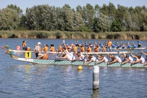 (250921) -- BUDAPEST, 21 septiembre, 2025 (Xinhua) -- Imagen del 20 de septiembre de 2025 de participantes compitiendo durante el Campeonato Nacional de Botes del Dragón de Hungría, en Fadd Dombori, Hungría. (Xinhua/Attila Volgyi) (oa) (ah)