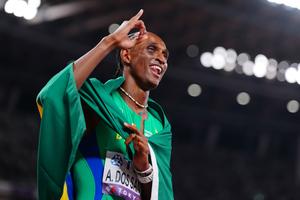 (250919) -- TOKIO, 19 septiembre, 2025 (Xinhua) -- Alison Dos Santos, de Brasil, festeja al término de la final de 400m con vallas masculinos en el Campeonato Mundial de Atletismo 2025, en Tokio, Japón, el 19 de septiembre de 2025. (Xinhua/Jia Haocheng) (rtg) (ra) (vf)
