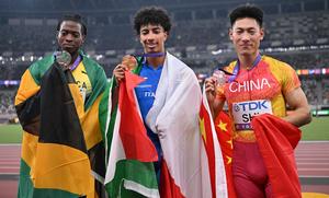 (250918) -- TOKIO, 18 septiembre, 2025 (Xinhua) -- Imagen del 17 de septiembre de 2025 del medallista de oro, Mattia Furlani (c), de Italia, el medallista de plata, Tajay Gayle (i), de Jamaica, y el medallista de bronce, Shi Yuhao, de China, posando para fotografías al término de la final de salto de longitud masculino, en el Campeonato Mundial de Atletismo 2025, en Tokio, Japón. (Xinhua/Song Yanhua) (rtg) (ra) (vf)