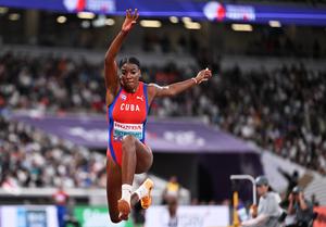(250918) -- TOKIO, 18 septiembre, 2025 (Xinhua) -- Leyanis Pérez Hernández, de Cuba, compite durante la final de salto triple femenino, en el Campeonato Mundial de Atletismo 2025, en Tokio, Japón, el 18 de septiembre de 2025. (Xinhua/Song Yanhua) (jg) (ah) (vf)
