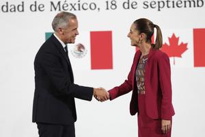 (250918) -- CIUDAD DE MEXICO, 18 septiembre, 2025 (Xinhua) -- La presidenta mexicana, Claudia Sheinbaum (d), estrecha la mano del primer ministro canadiense, Mark Carney (i), durante una conferencia de prensa conjunta, en Palacio Nacional, en la Ciudad de México, capital de México, el 18 de septiembre de 2025. (Xinhua/Francisco Cañedo) (fc) (vf) (ce)