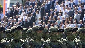 (250921) -- BELGRADO, 21 septiembre, 2025 (Xinhua) -- Imagen del 20 de septiembre de 2025 de un desfile militar conmemorando el Día de la Unidad, la Libertad y la Bandera Nacional de Serbia llevado a cabo, en Belgrado, Serbia. Serbia mostró su poderío militar el sábado con el desfile "Poder de la Unidad", llevado a cabo frente al Palacio de Serbia, marcando el Día de la Unidad, la Libertad y la Bandera Nacional de Serbia. De acuerdo con el Ministerio de Defensa, el desfile reunió a cerca de 10.000 elementos y presentó cerca de 2.500 piezas de armamento y equipamiento, incluyendo más de 600 vehículos, 70 aeronaves y 20 embarcaciones. (Xinhua/Wang Wei) (rtg) (ah)