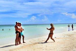 (250920) -- CAYO GUILLERMO, 20 septiembre, 2025 (Xinhua) -- Imagen del 19 de septiembre de 2025 de turistas extranjeros posando para una fotografía en una playa, en Cayo Guillermo, en el archipiélago de Jardines del Rey, en la provincia Ciego de Avila, Cuba. Un grupo de vacacionistas extranjeros alabó las bondades de la industria turística cubana y criticó las sanciones de Estados Unidos contra la isla caribeña, que dañan esa importante fuente de ingresos en divisas de la economía de la nación antillana. (Xinhua/Joaquín Hernández) (jh) (oa) (ra) (ce)