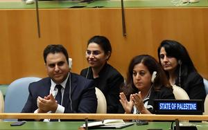 (250922) -- NACIONES UNIDAS, 22 septiembre, 2025 (Xinhua) -- Miembros de la delegación de Palestina aplauden durante la Conferencia Internacional...