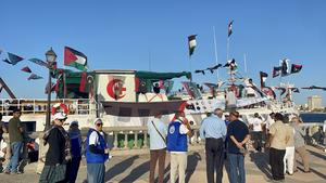 (250922) -- TRIPOLI, 22 septiembre, 2025 (Xinhua) -- Imagen del 21 de septiembre de 2025 de personas despidiéndose del buque...