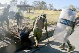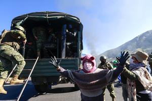 (250922) -- IMBABURA, 22 septiembre, 2025 (Xinhua) -- Elementos del Ejército de Ecuador detienen a un indígena en un bloqueo...