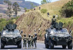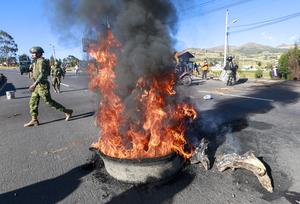 (250922) -- IMBABURA, 22 septiembre, 2025 (Xinhua) -- Elementos del Ejército de Ecuador vigilan un bloqueo realizado por indígenas durante...