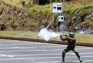 (250922) -- IMBABURA, 22 septiembre, 2025 (Xinhua) -- Un elemento del Ejército de Ecuador se enfrenta a indígenas en un...