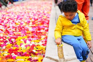 (250920) -- BOGOTA, 20 septiembre, 2025 (Xinhua) -- Un niño coloca una flor en la instalación floral "El Canto del...