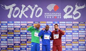 (250919) -- TOKIO, 19 septiembre, 2025 (Xinhua) -- El medallista de oro, Rai Benjamin (c), de Estados Unidos, el medallista...