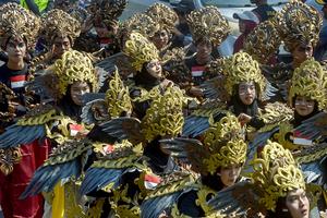 (250920) -- MAGELANG, 20 septiembre, 2025 (Xinhua) -- Artistas asisten al Carnaval Magelang Etno, en Magelang, en Java Central, Indonesia,...
