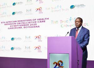 (250923) -- GABORONE, 23 septiembre, 2025 (Xinhua) -- Fabian Ndenzako, representante de la Organización Mundial de la Salud (OMS) en Botsuana y la Comunidad de Desarrollo de Africa Austral, habla en la Quinta Sesión de Ministros de Salud de Africa sobre Cuidados Paliativos, llevada a cabo como parte de la octava Conferencia Internacional Africana de Cuidados Paliativos y Servicios Afines, en Gaborone, Botsuana, el 23 de septiembre de 2025. La OMS instó el martes a los países africanos a priorizar la integración de los cuidados paliativos en los sistemas nacionales de salud, haciéndolos universalmente disponibles, accesibles y asequibles para todos los habitantes del continente. (Xinhua/Tshekiso Tebalo) (jg) (ra) (ce)