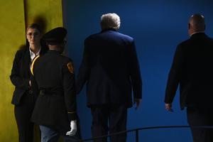 (250923) -- NACIONES UNIDAS, 23 septiembre, 2025 (Xinhua) -- El presidente estadounidense, Donald Trump (2-d), se retira después de pronunciar...