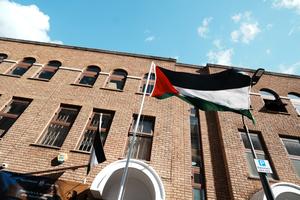 (250923) -- LONDRES, 23 septiembre, 2025 (Xinhua) -- Imagen del 22 de septiembre de 2025 de una bandera palestina ondeando...