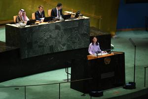 (250923) -- NACIONES UNIDAS, 23 septiembre, 2025 (Xinhua) -- Imagen del 22 de septiembre de 2025 de Annalena Baerbock (frente),...