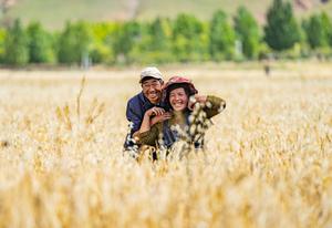 (250923) -- LHASA, 23 septiembre, 2025 (Xinhua) -- Agricultores son vistos en un campo de cebada de tierras altas, en...