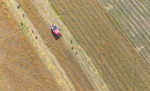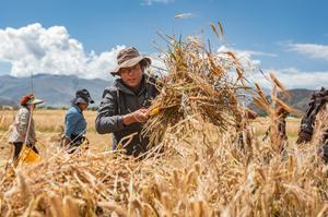 (250923) -- LHASA, 23 septiembre, 2025 (Xinhua) -- Agricultores trabajan en campos de cebada de tierras altas, en el distrito...