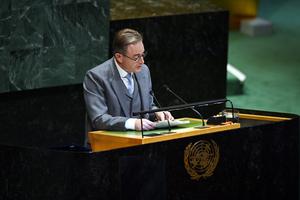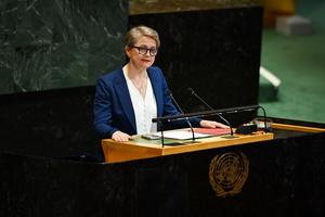 (250923) -- NACIONES UNIDAS, 23 septiembre, 2025 (Xinhua) -- Imagen del 22 de septiembre de 2025 de la ministra de...