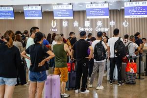 (250923) -- GUANGZHOU, 23 septiembre, 2025 (Xinhua) -- Pasajeros hacen fila para solicitar cambios y reembolsos de boletos en el...