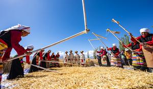 (250923) -- LHASA, 23 septiembre, 2025 (Xinhua) -- Agricultores desgranan los cultivos de forma tradicional, en el distrito de Lhunzhub,...