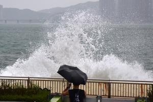 (250923) -- HONG KONG, 23 septiembre, 2025 (Xinhua) -- Olas chocan contra una costa, en Hong Kong, en el sur...
