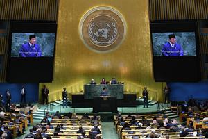 (250923) -- NACIONES UNIDAS, 23 septiembre, 2025 (Xinhua) -- El presidente indonesio, Prabowo Subianto, pronuncia un discurso durante el debate...
