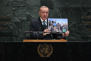 (250923) -- NACIONES UNIDAS, 23 septiembre, 2025 (Xinhua) -- El presidente turco, Recep Tayyip Erdogan, muestra una fotografía de Gaza...