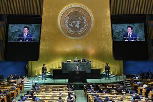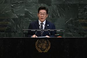 (250923) -- NACIONES UNIDAS, 23 septiembre, 2025 (Xinhua) -- El presidente surcoreano, Lee Jae-myung, pronuncia un discurso durante el debate...