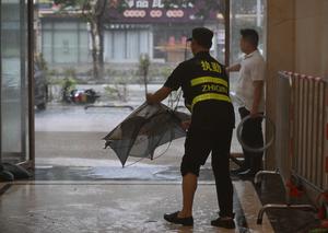 (250924) -- YANGJIANG, 24 septiembre, 2025 (Xinhua) -- Un trabajador cuida un paraguas dañado por el viento en un hotel,...