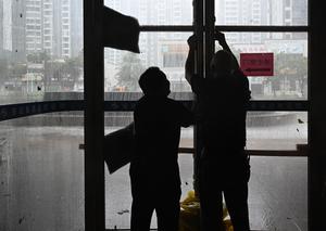 (250924) -- YANGJIANG, 24 septiembre, 2025 (Xinhua) -- Trabajadores refuerzan una puerta de vidrio en un hotel, en la ciudad...