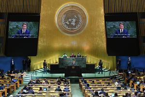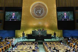 (250924) -- NACIONES UNIDAS, 24 septiembre, 2025 (Xinhua) -- Imagen del 23 de septiembre de 2025 del secretario general de...