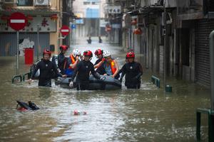 (250924) -- MACAO, 24 septiembre, 2025 (Xinhua) -- Trabajadores de la autoridad aduanera local ayudan a ciudadanos varados a evacuar...