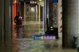 (250924) -- MACAO, 24 septiembre, 2025 (Xinhua) -- Un ciudadano vadea por el agua de la inundación en una calle,...